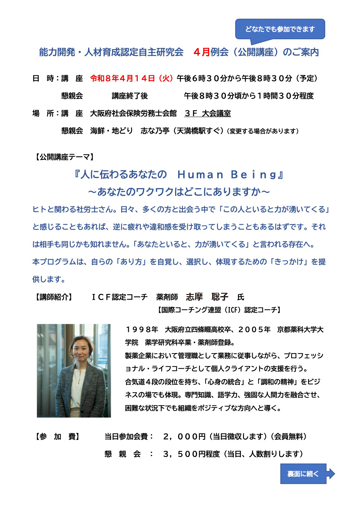 尚、4月の定例会は公開講座のため、参加費として2,000円申し受けます(当日徴収いたします)